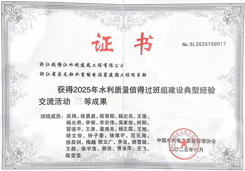 近日,中國水利電力質(zhì)量管理協(xié)會公布2025年度水利質(zhì)量信得過班組建設典型經(jīng)驗交流活動評選結果,慶元抽蓄籌建期EPC總承包項目憑借扎實有效的質(zhì)量管理實踐和突出的建設成果,榮獲“2025年水利質(zhì)量信得過班組建設典型經(jīng)驗交流活動”三等成果。這一榮譽不僅為“浙錢水建”品牌再添光彩,更標志著公司在工程質(zhì)量管理領域獲得了行業(yè)權威機構的高度認可。