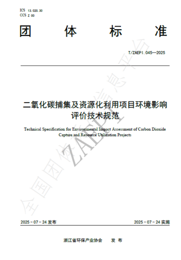 2025年7月24日,由浙江省環(huán)保集團生態(tài)環(huán)保研究院牽頭制定的《二氧化碳捕集及資源化利用項目環(huán)境影響評價技術規(guī)范》(T/ZAEPI 045-2025)團體標準正式發(fā)布并實施。該標準由浙江省環(huán)保產(chǎn)業(yè)協(xié)會歸口管理,聯(lián)合省內(nèi)多家環(huán)保領域骨干企業(yè)共同起草,填補了工業(yè)領域二氧化碳捕集及資源化利用項目環(huán)評技術規(guī)范的空白。